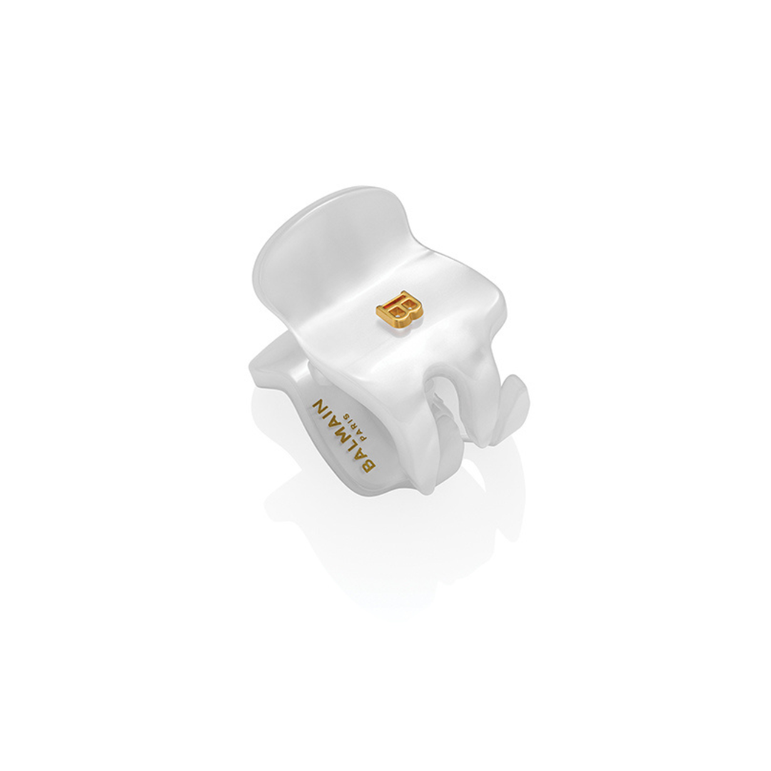 Balmain Hair Couture præsenterer deres Limited Edition Pince à Cheveux Extra Small Pearl, en håndlavet hårklemme designet til at kombinere funktionalitet med luksuriøs æstetik. Denne ekstra lille klemme er fremstillet af holdbart celluloseacetat og prydet med Balmain's karakteristiske 18K guldbelagte 'B'-logo. Designet er inspireret af det tidløse perlemønster, hvilket giver et elegant og sofistikeret udtryk.